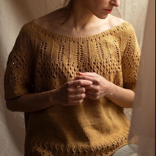 Начать вязать лето уже сейчас, чтобы подготовиться к сезону! Этот топ с короткими рукавами и широким вырезом горловины подойдет для теплого сезона, а несложные узоры помогут быстро завершить такой красивый процесс.